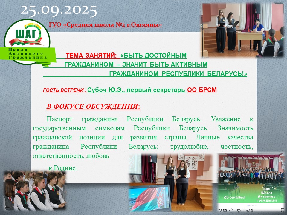 В фокусе обсуждения: паспорт гражданина Республики Беларусь. Уважение к государственным символам Республики Беларусь. Значимость гражданской позиции для развития страны. Личные качества гражданина Республики Беларусь: трудолюбие, честность, ответственность, любовь к Родине
