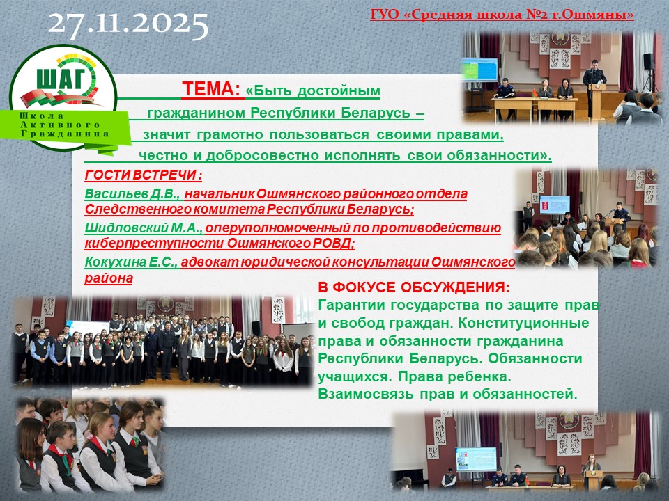 Гости встречи: Васильев Д.В., начальник Ошмянского районного отдела Следственного комитета Республики Беларусь; Шидловский М.А., оперуполномоченный по противодействию киберпреступности Ошмясного РОВД; Кокухина Е.С., адвокат юридической консультации Ошмянского района