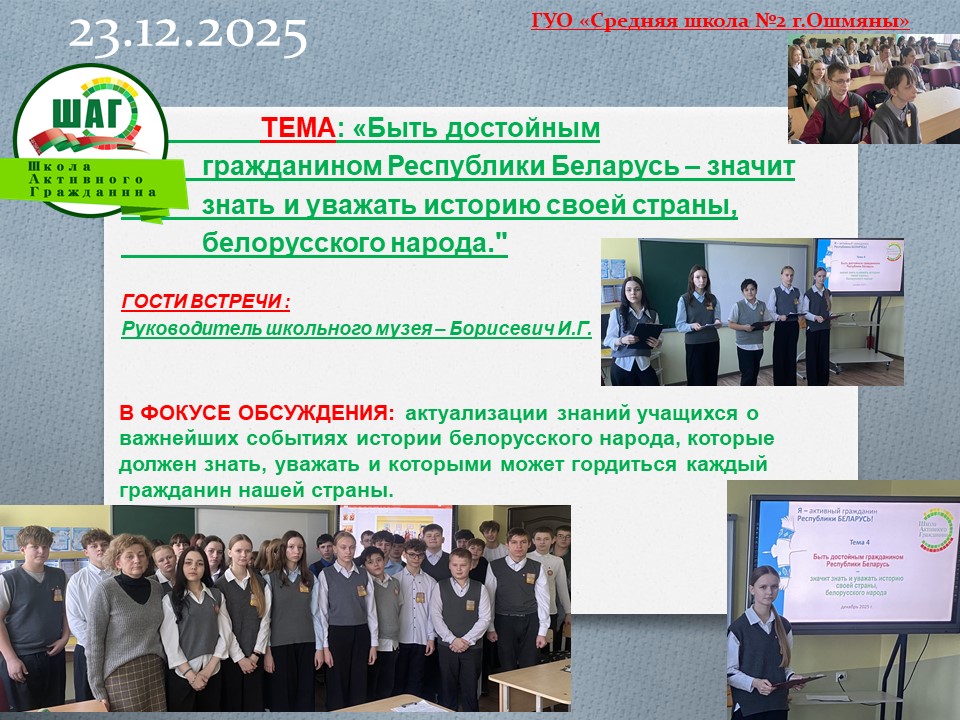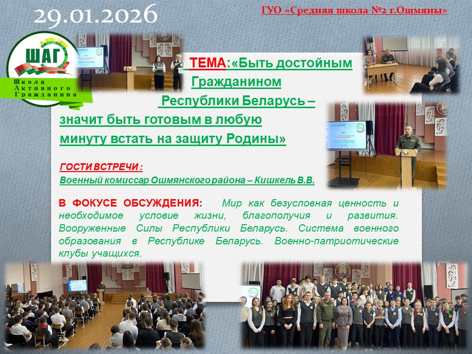 В фокусе обсуждения: Мир как безусловная ценность и необходимое условие жизни, благополучия и развития. Вооружение Силы Республики Беларусь. Система военного образования в Республике Беларусь. Военно-патриотические клубы учащихся