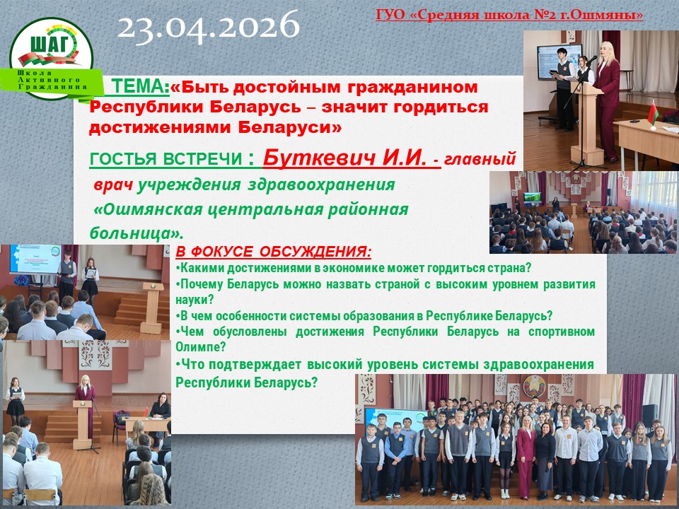 В фокусе обсуждения: Какими достижениями в экономике может гордиться страна? Почему Беларусь можно назвать страной с высоким уровнем развития науки? В чем особенности системы образования в Республике Беларусь? Чем обусловлены достижения Республики Беларусь на спортивном Олимпе? Что подтверждает высокий уровень системы здравоохранения Республики Беларусь?
